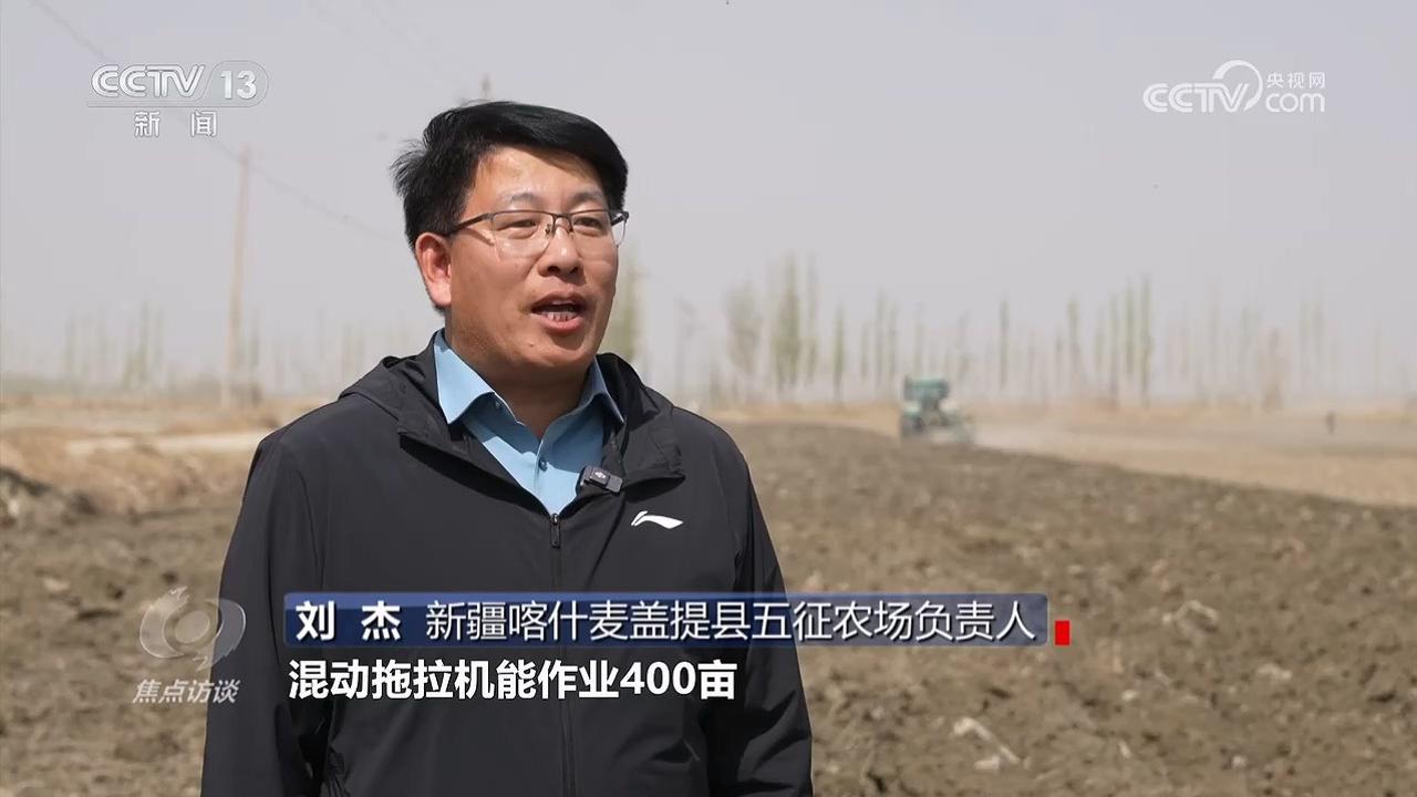 在塔克拉玛干沙漠西南边缘的新疆喀什麦盖提县五征农场,记者看到大规模机械化春耕作业已经开始,多台大马力拖拉机列成“雁阵”,正在棉田里进行春耕的第一道工序——犁地。
